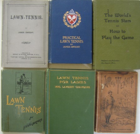 018: “Lawn Tennis” by H.W.W. Wilberforce; 1st USA edition of 1890 in small (12mo) format hardboards, externally decorated with 77 pages. Including a chapter for Ladies by Mrs Hillyard, this is a book first published in England in 1889, and here published in the USA. This copy is in lovely clean condition, tight and together, and one of the earliest USA coaching titles. £400/US$800 019: “Lawn-Tennis” by James Dwight; 1st USA edition of 1886 in small format (12mo) hardboards with 94 pages. This truly is the first serious lawn tennis coaching title published in the USA by a man known as the father of American lawn tennis, and after whom the Davis Cup was named. This copy is in superb condition, clean, complete and tight. £750/US$1500 020: “Lawn Tennis for Ladies” by Mrs. Lambert Chambers; 1st UK edition of 1910 in small format hardboards with 135 pages (and 31 pages of advertisements). Mrs Lambert Chambers (or Dorothea Douglass) had a formidable Wimbledon record, which symbolically came to an end in 1919 against the new girl, Suzanne Lenglen in a truly epic final. The author aims her coaching title at women, and her main opponents of the period give their views on her in frank submissions at the end of the book. As far as I am aware this is the first book on tennis for women written by a woman. It is in superb condition. £145/US$290 021: “Lawn Tennis Hints to Beginners”; no named author, but published by Wright & Ditson in the USA in 1906 in small format paper covers with c75 pages. This is not a brilliant copy but it is not recorded and certainly not seen by me previously. It contains lovely full page drawings of a player demonstrating the shots and is written for the novice. Its condition leaves quite a lot to be desired as the photo shows but it has its own special charm. It is priced relative to condition as well as rarity. £50/US$100 022: “Practical Lawn Tennis” by James Dwight; 1st USA edition of 1893 in small format (12mo) hardboards, beautifully decorated externally with 168 pages. Here is Dwight’s second coaching manual and here he acknowledges that some of his opinions have been altered following his visit to play at Wimbledon. This is one of the earliest tennis books I have seen with photographs showing the various shots. This copy is in superb condition, very clean and bright externally, without foxing. £500/US$1000 023: “The World’s Tennis Stars and How to Play the Game” by Pat O’Hara Wood; 1st edition (Australia) of 1926 with 117 pages. I think this is the second major lawn tennis book in the Australian bibliography and as such it is richly illustrated with black and white photographs of world stars and several top Australian players of the period. In lovely condition. £200/US$400 LAWN