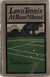 TENNIS LITERATURE I am unable to find any 1st edition lawn tennis books published anywhere in the world in 1901 or 1902. But 1903 was a vintage year, not for quantity but definitely for quality. The two following titles mark 1903 as an exceptional year. These titles signalled the start of the 20th century in the lawn tennis bibliography in a remarkable manner, and the books are as important as any you will find. 024: “Lawn Tennis at Home & Abroad” edited by A. Wallis Myers; 1st UK edition of 1903 in beautifully decorated hardboards with 328 pages. This was Myers’ first major work. It is a review of the state of lawn tennis in England, Europe, Australasia, and India. Several well known authors/players have combined their impressions into this book, which is also a huge treasure trove of photos of very many of the top players of that iconic era playing the game, or merely posing for portraits. This copy is in very good condition, tight and bright, with just a little staining externally. (See photo) £350/US$700