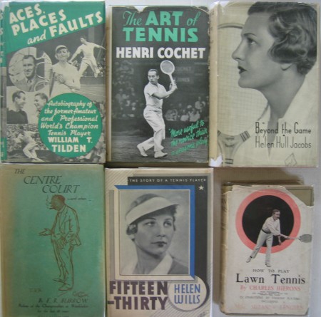 029: “Art of Tennis (The)” by Henri Cochet; 1st UK edition of 1936 with 182 pages. One of the French Musketeers writes his own coaching manual as translated from the original French. It is well illustrated with freeze frame photos of him demonstrating the main shots. There is a previous owner’s inscription internally, and the dust-jacket is a little edge frayed. £50/US$100 030: “Beyond The Game” by Helen Hull Jacobs; 1st UK edition of 1936 with 212 pages. This is the first biography of a woman tennis player in English. Only Suzanne Lenglen’s story by Claude Anet of 1927 predates this. Jacobs was often the bridesmaid to Wills until she eventually gained her Wimbledon title. The dust-jacket lacks very small portions on the spine. £125/US$250 031: “Centre Court…..and Others (The)” by F.R. Burrow; 1st UK edition of 1937 with 312 pages, Burrow was the Wimbledon Referee from 1919 to 1936 as well as referee to countless other mostly UK events in that period. His reminiscences of the happenings on and off court are fascinating. He was a most annoyingly calm man who took no nonsense from the players and almost always managed to get his events finished on time. The dust-jacket is somewhat spine faded but otherwise very good. £100/US$200 032: “Fifteen-Thirty: The Story of a Tennis Player” by Helen Wills; 1st USA edition of 1937 with 311 pages. She was the heiress to Suzanne Lenglen, and both dominated the women’s game throughout the 1920s and the 1930s. This is a very personal account of her life both on and off the court and she illustrated the book with lovely photos of herself as well as images painted by her. The dust-jacket is in very good condition with just a little lower edge fraying. £200/US$400 033: “How To Play Lawn Tennis” by Charles Hierons; revised and enlarged edition of 1922 with 190 pages. This was a very popular post Great War book written by the head professional at The Queen’s Club to remind people how to play the game most had not played since 1914. There are some nice photos taken at The Queen’s Club both of the author and other players. The dust-jacket has seen better days with small edge portions absent, but 1922 is VERY early for a dust-jacket to survive. £50/US$100