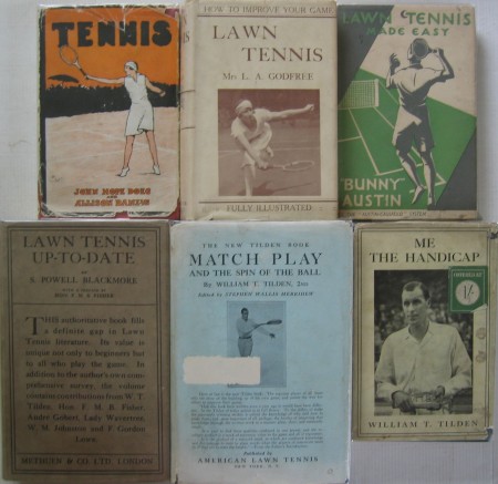 035: “Lawn Tennis: How to Improve Your Game” by Mrs. L.A. Godfree; 2nd edition of 1928 with 250 pages. The first edition was issued under her maiden name as Kathleen McKane, but she married Leslie Godfree before the 2nd edition was published. She had won the Wimbledon Singles twice by now and was the world’s top player, until Suzanne Lenglen dislodged her. She demonstrates the shots herself in the photos. The dust-jacket is in very good condition, not even price-clipped. £80/US$160 036: “Lawn Tennis Made Easy” by Bunny Austin; 1st UK edition of 1935 with 109 pages. Profusely illustrated with photos of Austin showing off his shots. Written while Austin was at the top of his game, now no 2 to Fred Perry. The book includes a short press piece about Captain George Caulfield, Austin’s coach. Book and dust-jacket are in beautiful condition. £65/US$130 037: “Lawn Tennis Up-To-Date” by S. Powell Blackmore; 2nd edition of 1924 with 233 pages. So far I have been unable to find any information on Mr Blackmore, so would welcome any reader’s comments on who he might have been. He writes his introduction as from The Queen’s Club so I assume he was English. His book is a major work, beautifully illustrated with photos of players in action, the photos still covered with original tissue guards. This very early dust-jacket is in very good condition. There is a previous owner’s inscription “Beatrice Ayscough 1924” on the front end page. £275/US$550 038: “Match Play and the Spin of the Ball” by William T. Tilden, 2nd, edited by Stephen Wallis Merrihew with 355 pages. I have never seen this book in a dust-jacket so this is a revelation. Tilden’s book is a seminal work, considered today as probably the most authoritative coaching manual ever written. John Newcombe always travelled with a copy in his bag. The coaching section is followed by a fascinating mini-biography of Tilden written by Merrihew. The book is heavily illustrated with photos of many of Tilden’s main opponents showing how they play the shots he is describing. The dust-jacket is worn at the edges with a small portion on the reverse panel absent. £500/US$1000 039: “Me The Handicap” by William T. Tilden; 1st UK edition of 1929 with 164 pages. His enormous ego comes out well in this book, largely about his victories, his battles with authority, his pretensions to be an actor, his role as an international tennis player and much more. The dust-jacket is a little frayed and stained at the edges but it is complete. £95/US$190
