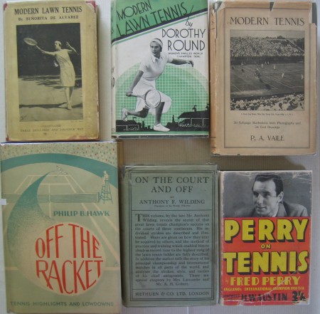 041: “Modern Lawn Tennis” by Dorothy Round; 1st UK edition of 1934 with 106 pages. The English Women’s Singles World Champion of 1934 writes about her coaching advice for all aspiring top players, and the book is illustrated with plenty of photos of her demonstrating the shot. The dust-jacket is slightly stained on the reverse of the book. £65/US$130 042: “Modern Tennis” by P.A. Vaile; 2nd revised edition of 1917 with 317 pages. One of the great tennis theorists, Vaile wrote several cerebral coaching titles. It is superbly illustrated with 50 photos of top players demonstrating the various shots, as well as 34 line drawings. The dust-jacket, almost certainly the earliest I have seen on a tennis book, is split at the spine and edge frayed but otherwise complete, and thus exceptional. £300/US$600 043: “Off The Racket: Tennis Highlights and Lowdowns” by Philip B. Hawk; 1st USA edition of 1937 with 391 pages. This is quite the best history of the game written in the 1930s, and it is quite heavily accented towards the American game. It is full of quirky stories gleaned by the author who was often present at the right time. This copy, which I offered last newsletter, is handsomely inscribed by the author and signed, and it is in a beautiful and rare dust-jacket, not seen previously. £225/US$450 044: “On The Court And Off” by Anthony F. Wilding; 8th UK edition of 1921 with 273 pages. The fact that this book went to at least 8 editions after first being published in 1912 shows just what a major public figure he was, and sales of his book would have been boosted by his tragic death in 1916. This is an exceptionally early dust-jacket in good condition. £150/US$300