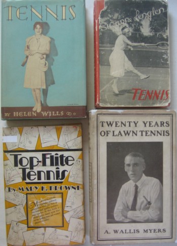 046: “Tennis” by Helen Wills; 1st USA edition of 1928 with 214 pages. Her coaching title proved very popular in the USA, as she was at this time the top player in the world, as Suzanne Lenglen started to wane. All the illustrations are reproductions of her own water-colours showing various players in action. The dust-jacket is complete with two small tears at the margin. £65/US$130 047: “Tennis Das Spiel Aller Nationen” by Suzanne Lenglen; 1st German edition of 1925 with 120 pages. Here is one of several translations of her famous book “Tennis The Game of Nations”. It was a top selling books in the mid 1920s as she was the leading female icon of the entire world. The dust-jacket is well edge frayed with tiny loss at corners and spine. £50/US$100 048: “Top-Flite Tennis” by Mary K. Browne; 1st USA edition of 1928 with 128 pages. Described as the National Women’s Singles Champion and Captain of the USA Wightman Cup team, this is a coaching book from a very competent tennis player. It is beautifully illustrated with full page line drawings. She has personally inscribed and signed the front end paper date May 27 1930. The dust-jacket is highly decorative and although a little darkened, in very good condition. £250/US$500 049: “Twenty Years of Lawn Tennis” by A. Wallis Myers; 1st UK edition of 1921 with 180 pages. Myers was an expert player and later became the lawn tennis correspondent of the Daily Telegraph. His book recounts his own travels to play tennis and the many major matches he witnessed. His opening remarks are to regret the closing of the All England Club’s ground at Worple Road. The book is slightly eased internally at the front, and the dust-jacket is edge frayed at the top with a small portion absent on the spine. The book is very hard to find and is a splendid tennis history of the first 20 years of the 20th century. £125/US$250