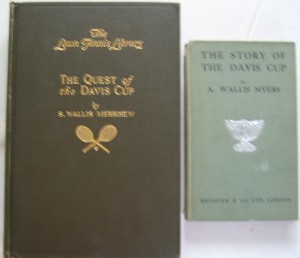 051: “Story of the Davis Cup (The)” by A. Wallis Myers; 1st UK edition of 1913 in small format 12mo hardboards, with 103 pages, externally a silvered Davis Cup raised on the front board. The first four chapters in this lovely little book are taken from Myers’ earlier book “The Complete Lawn Tennis Player” (1908). The final chapters bring the story upto date. Every individual tie score is here up to the end of the 1912 competition; in very good condition with tiny loss at the head of the spine £250/US$500