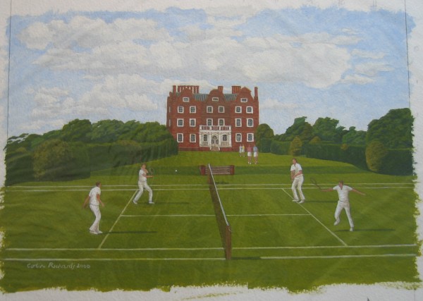 085: “A Gentlemen’s Doubles” painted by Colin Richards and dated 2000. (See below.) This is an interesting perspective of a tennis match in front of a grand house. The image measures 31cm x 21cm (approx) and is I think in water-colour. It is painted on art paper and it is ready for matting and framing. The work is original and not a copy. I have 2 others in this series. £250/US$500