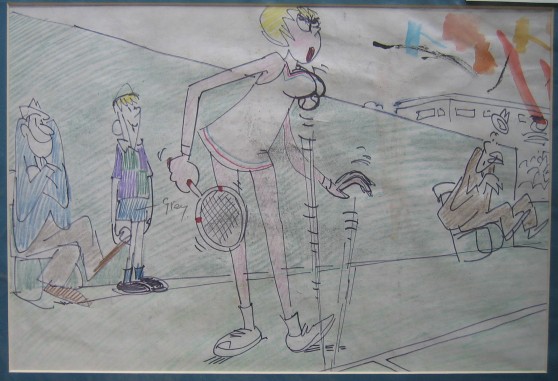 086: “John McEnroe signed photo”; signed for me specially at the Royal Albert Hall last December; a splendid action photo of JM nicely matted and titled. The photo measures 19.5cm x 24.5cm. £40/US$80 087: “Richard Krajicek signed photo”; shows him in 1996 clutching the Wimbledon Gentlemen’s Singles trophy having just beaten MaliVai Washington. It was the day of the blonde buxom streaker, which I remember well! The image measures 25cm x 30cm and is ready for matting and framing. £40/US$80 088: “Oops!” (my title not the artist’s). This is the original hand-drawn and hand-coloured artwork by the famous Daily Express cartoonist Roy Ullyett (see below). He was the leading Fleet Street cartoonist for many years in the second half of the 20th century. This is a Wimbledon cartoon with obvious connotations which I don’t need to spell out to my readers. The image measure 31cm x 21cm, and is already matted, thus ready for framing. It is not signed but his drawings are unmistakable. £250/US$500
