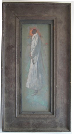 089: “Tennis Player in Overcoat”; a painting (medium uncertain) dated “06” showing a male tennis player in side-on profile wearing a typical overcoat of the period (as did the Dohertys and others) and carrying a tennis racket. This is an original work showing the figure against a dark background by an unknown artist. The image measures 12.5cm x 38cm and it is painted on board, set loosely into a period frame. There is a very faint caption at the player’s feet which reads “An Idyll”. It is in seemingly very good condition. (See photo) £250/US$500