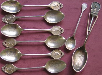 One major change is that the USA, Australia and Japan are now all at the same rate. If asked, I will always offer surface mail. This will be much less costly but will entail quite lengthy delays with delivery. VARIOUS TENNIS COLLECTIBLES 092: “A Set of 6 Matching Silver Tennis Spoons”. These are hall-marked in Birmingham 1929, 1930, 1932, and 1933. They are in superb condition with the initials “GPLTC” inscribed in the bowl. They measure 12cm long. (See photo) £120/US$240 093: “Silver Tennis Spoon”; ornately decorated and marked “Sterling”. From the shape of the racket, this spoon is probably from around the start of the 20th century. The bowl is decorated with a named view of Notre Dame Cathedral. The spoon is in very good condition, and is highly unusual. Measures 14.5cm long. (See photo) £100/US$200