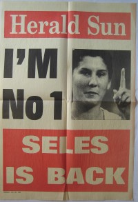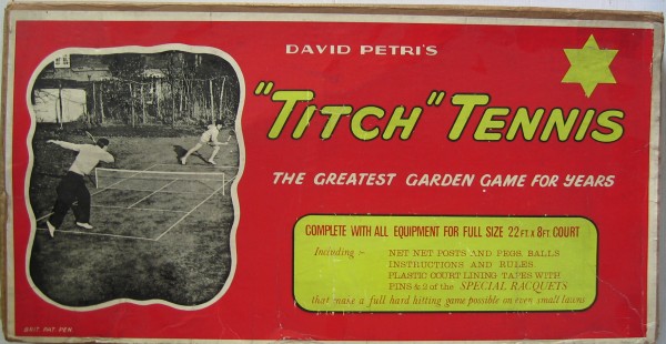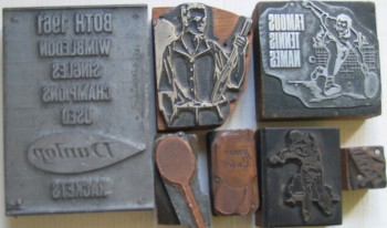 094: “Silver Tennis Spoon”. This is hall-marked Sheffield 1931. It is a beautiful slender little spoon with tennis racket finial. It is inscribed “CLTC” on the reverse and it measures 9.75cm long. (See photo) £35/US$70 095: “Tennis Theme Printer’s Blocks x 7”. Here are 7 old printer’s blocks as used for stamping onto paper, thus the image is shown in reverse. The 7 blocks all have a tennis theme including one from Dunlop (8cm x 11cm), an umpire’s chair, and other tennis themes. They all seem to be in very good condition and are offered as one lot. (See photo) £40/US$80 096: “Monica Seles Newspaper Hoarding”: From the Herald Sun (?Australia) comes this newspaper hoarding measuring 39cm x 55cm (approx) dated Monday July 31 1995. The text reads “I’m No 1 Seles is back”. (See pic) £25/US$50 097: “Titch Tennis: The Greatest Garden Game for Years” by David Petri. This is a large box measuring 61cm x 31cm x 6cm containing the equipment to be used for this game for young people, including two racquets, a net with posts and metal ties, 4 rubber balls and the little rules booklet. There is no date anywhere but from the form of address of the printers of the rules booklet, I guess at 1950s/1960s. The box and its contents are seemingly unused, in excellent condition. (See below) £75/US$150