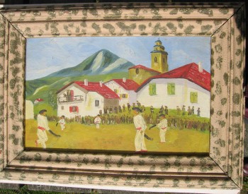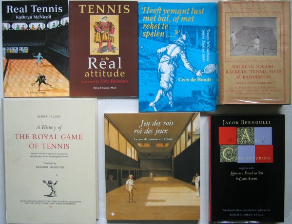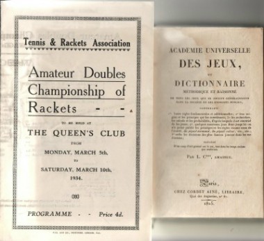 07: “Pelota Oil Painting”: A delightful and highly coloured view (c1930) of a Pelota fronton, presumably in a little village somewhere in the Basque country with the Pyrenees in the background. The picture speaks for itself. It is oil on a board, the image measuring 37cm wide and 23cm tall. No artist’s signature is visible, and the board is set into what appears to be a contemporary frame. Both are in very good condition. (P) £500/US$900 LITERATURE 08: “ACADEMIE UNIVERSELLE DES JEUX”; French language edition of 1825; 460 pages in very small format hardboards marbled internally. An edition of this very famous book on games and sports; Longue Paume is at pages 169 to 172 and Paume is at pages 202 to 209. (P) £300/US$550 09: “The ANNALS OF TENNIS” by Julian Marshall; facsimile edition of 1973 in small 4to format green boards, externally gilt decorated with 226 pages. This is the definitive English language book on Tennis in the 19th century by a master of the game and expert historian. £135/US$240 10 (A): “The ART OF CONJECTURING” by Jacob Bernoulli; 1st English translation of 2006 of the Latin/Italian edition of 1713; 430 pages. This series of mathematical essays includes one on the odds for scoring in Tennis at the start of the 18th century. (P) £100/US$180