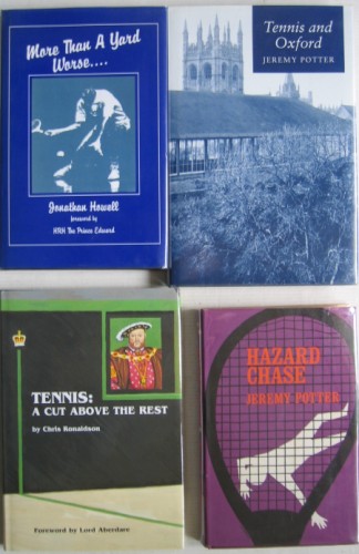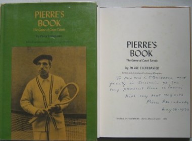 28: “The MANCHESTER TENNIS AND RACQUET CLUB” by Nigel Kenyon et al; 1st edition of 1980 in an edition of 350 numbered copies; 97 pages. A great history of the famous north of England racket club, well illustrated. £250/US$450 29 (A): “MELBOURNE TO MYOPIA: Reflections on my visits to the Real Tennis Courts of the 20th century” by George Limb; 1st de luxe edition of 60 copies in leatherette boards in a blue card slip-case; 2002 with 170 pages. Limb fulfils every tennis player’s dream by visiting all and playing on nearly all the extant courts of the world. £150/US$270 29 (B): “MELBOURNE TO MYOPIA: Reflections on my visits to the Real Tennis Courts of the 20th Century” by George Limb; 1st standard edition of 470 copies with 170 pages in large 8vo hardboards; 2002. £75/US$130 30: “MORE THAN A YARD WORSE” by Jonathan Howell; 1st de luxe 8vo edition of 1995; 173 pages. Jonathan describes the entertaining characters he has met, the tournaments he has played and the courts where he coached and competed. (P) £75/US$130 31 (A): “PIERRE’S BOOK: The Game of Court Tennis” by Pierre Etchebaster; 1st USA edition of 1971; 78 pages; 4to in hardboards and pictorial dust-jacket. Coaching advice of the undefeated World Champion 1928/54. His opponents write about him and his game. (P) £125/US$225 31 (B): “PIERRE’S BOOK: The Game of Court Tennis” by Pierre Etchebaster; 1st USA edition of 1971; as above but this copy has been handsomely inscribed and signed by Etchebaster in his very characteristic hand-writing. (P) £300/US$540 32: “The QUEEN’S CLUB STORY 1886-1986” by Roy McKelvie; 1st edition of 1986; 306 pages; 4to in hardboards and decorative dust-jacket. This famous London club is the home of Tennis and Rackets, but many other sports have been played throughout its 100 years. £35/US$60