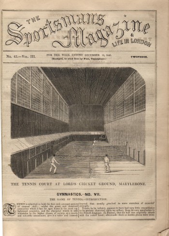 16: “An EXHIBITION OF TENNIS AND RACKETS” as organised by Jonathan Edwardes at The Queen’s Club in London 9th to 17th October 2004. The illustrated catalogue (A4) of Edwardes’ exhibition listing books, images, antique rackets, silver trophies etc. £15/US$25 17: “The FIELD: The Country Gentleman’s Newspaper Saturday March 28 1868”. This is the entire edition of 34 pages in large folio format, containing a myriad of articles on all sorts of field and athletic sports. Page 252 has a short match report on the Cambridge University Challenge Cup at Racquets; and page 253 has another short match report on the Oxford University Racquet at Tennis. The final page is called “Croquet Tactics” being four coloured diagrams of various Croquet problems. The newspaper has the occasional torn edge and some minor damage to the front page, but otherwise is in splendid condition. £50/US$90 18: “The FIELD BOOK or SPORTS AND PASTIMES OF THE BRITISH ISLANDS”; 1833; 563 pages in 8vo green boards. A pre-Victorian A-Z dictionary of sports etc, including one line on Racket (sic) and 1 ¼ pages on Tennis. Note “chaces”! £150/US$270 19: “FIFTY YEARS OF SPORT AT OXFORD AND CAMBRIDGE”; two massive folio sized leather bound volumes of 332 and 325 pages; 1913. Certainly the most impressive books I have seen, these are exhaustive reports on all the sports in which Oxford and Cambridge Universities have competed since the middle part of the 19th century right up to the date of publication. All the racket sports are very thoroughly covered including Real Tennis and Rackets. These are stunning volumes. £600/US$1100