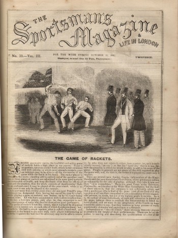 45 (B): “TRATTATO DEL GIOUCCO DELLA PALLA” by Antonio Scaino da Salo; facsimile edition of 1968; 500 copies in a card slip-case, the book in brown ¾ morocco boards internally marbled. This is a very little known edition and extremely hard to find. £500/US$900 45 (C): “SCAINO ON TENNIS” by Antonio Scaino da Salo; 2nd English translation of 1984 in a standard edition of 400 numbered copies; 197 pages in large 4to format. Here is a revised and improved English translation of the 1555 Italian original. (P) £150/US$270 46: “SCHAUPLATZ DER KUNSTE UND HANDWERKE” (Showcase of the Arts and Crafts); volume Vll of a large run of volumes here in German (1768) but originally in French (1767). The volume contains a series of authoritative essays on a wide range of crafts, and prominent amongst these in this very rare volume is “Die Kunst der Ball-und Raquettemacher und vom Ballspiele” by Herrn von Garsault. This is better known in English as “The Art of the Tennis-Racket-Maker and of Tennis” by de Garsault, usually seen in large folio size. Here in the German the size is standard 4to, and this is bound into what appears to be its original leather boards and ribbed spine. The effect of the reduced size is that the French text of some 38 pages is now extended to about 50 pages. In addition, the 5 large plates are now folded and extend out from the book in landscape format. There is a very small element of water staining at the top of some of the pages though this seems not to extend into the plates. I have never seen an entire volume and I have only ever seen one of the German texts which had been extracted/removed from the original full volume. (P) £4500/US$8100 47: “The SPORTSMAN’S MAGAZINE: Life in London and the Country”; edited by “Miles’s Boy”, the third volume published in 1847; 300 pages in original large 4to hardboards. This is a sports magazine which only went into three years of publication; this volume contains many articles on a wide variety of athletic and country sports. The volume contains 8 parts of a connected work on Tennis at pages 181/2, 196/7, 210/11, 225/6, 232/3, 244/5, 256/7, and 268/9. The interior of the earlier court at Lord’s is beautifully illustrated. Probably the first major article seen on the game of Rackets (dated October 10 1846) is at pages 61/2 and this includes a wonderful engraving. Articles can also be found about Cricket at pages 22/3, 45, 57, 67, 79, 149/50, and 165/6. The Real Tennis bibliography previously lacked any major titles between the Lukin of 1822 and the Marshall of 1878. This volume with its text on Real Tennis in the mid-1840s there represents what is at the moment the only known English text on the game of the early Victorian period, and as a bonus it also contains a series of articles on Cricket. The book is in good condition, the boards a little eased. (P) £1000/US$1800