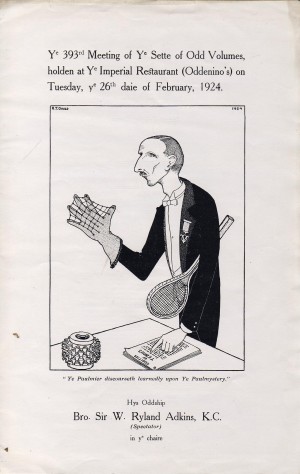 61: “TREATISE ON THE ROYAL GAME OF TENNIS” by de Manivieux; from the French 1783, English translation 2004; 8vo green boards; in an edition limited to 350 copies. The state of the game in the mid-18th century in France where it was incredibly popular. (P) £75/US$135 62: “TUDOR TENNIS: A Miscellany” by Roger Morgan; large 4to de luxe edition; (50 copies); 2001; 175 pages; signed by the author, page edges gilt. Morgan on the Elizabethan era and the popularity of Tennis; many town plans, engravings, drawings & photographs. (P) £125/US$225 63: “TWO CENTURIES OF REAL TENNIS” by John Shneerson; 1997; (300 copies); 86 pages 8vo. The story of how the old Tennis court at Newmarket was transformed from a garage repair shop back to its original state as a now thriving Real Tennis club. (P) £75/US$135 64: “The WILLIS FABER BOOK OF TENNIS & RACKETS” by Lord Aberdare; 1st standard edition of 1980; large 4to with 368 pages. Historical report of both sports, reports from the clubs in the world, championships records, etc. £95/US$170 65: “WORLD REAL TENNIS CHAMPIONSHIP 2006 PROGRAMME” played at The Oratory Tennis Court near Reading in Berkshire over the 25th to the 29th April 2006 between the holder, Rob Fahey of Australia and the leading challenger Tim Chisholm of the USA. Fahey won by 7 sets to 0. (P) £10/US$18 66: “YE SETTE OF ODD VOLUMES”; a menu prepared specially for a dinner given at Oddenino’s Restaurant in London to honour E.B. Noel on Tuesday 26th February 1924, to celebrate the impending publication of his magnum opus ”A History of Tennis” in two volumes. A programme of events for the evening is listed, and each event is given a term as used in the game of Tennis. This is a splendid piece of 1920s Tennis ephemera in very good condition internally and externally. (P) £100/US$180 OBJECTS